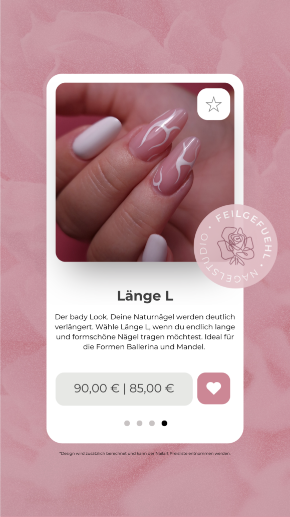 Hier findest du unsere aktuelle Preisliste für Gelnägel, Maniküren und Nailart. Bitte beachte unsere AGB.